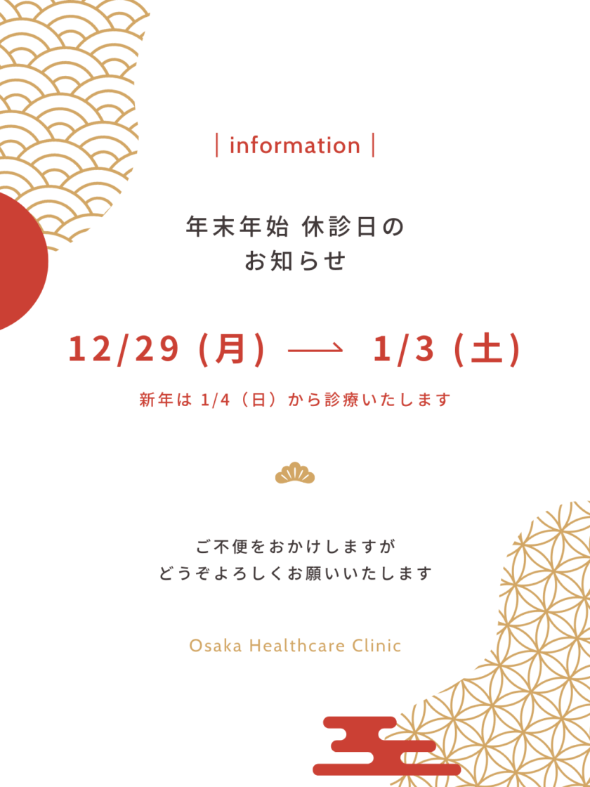 誠に勝手ながら、年末年始の診療スケジュールを以下の通りとさせていただきます。