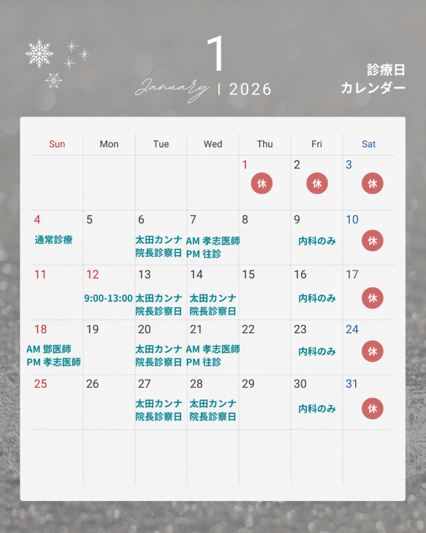 また、1/18は午前中のみ、総合診療科の鄧(トウ)医師が担当いたします。午後は通常通り太田孝志医師が診療いたします。
