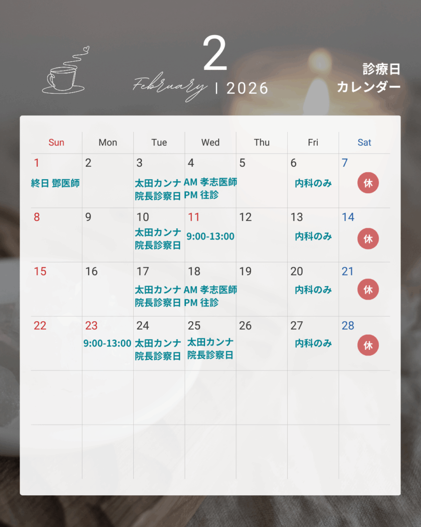 2月の診療時間のご案内 投稿日:2026.02.02 2月の診療スケジュールについてお知らせいたします。 今月は祝日の影響で、診療時間の変更がございます。 ご来院の際は、こちらのカレンダーを事前にご確認いただけますようお願い申し上げます。 ⚠️ 2/11(水)・2/23(月)の診療時間は9:00~13:00となります。 連休前後は混雑が予想されますので、お時間に余裕を持ってお越しください。